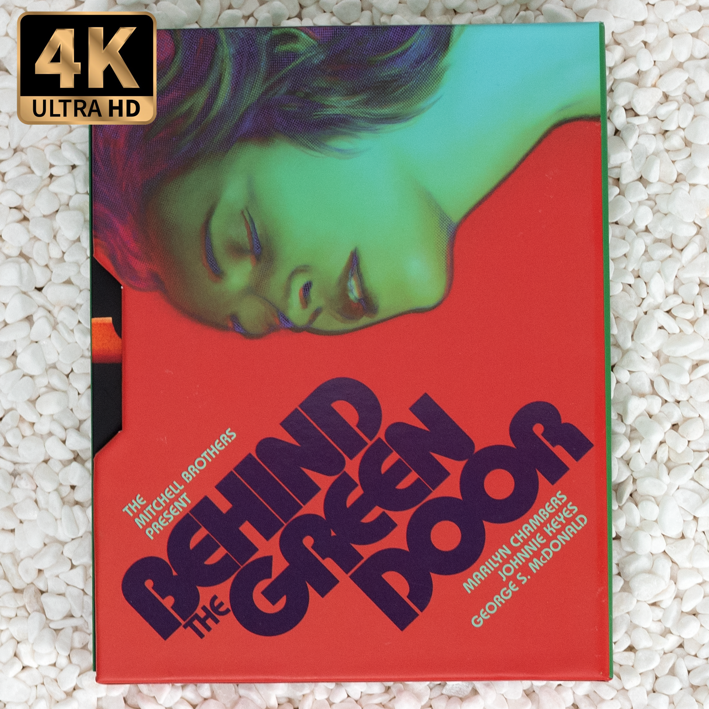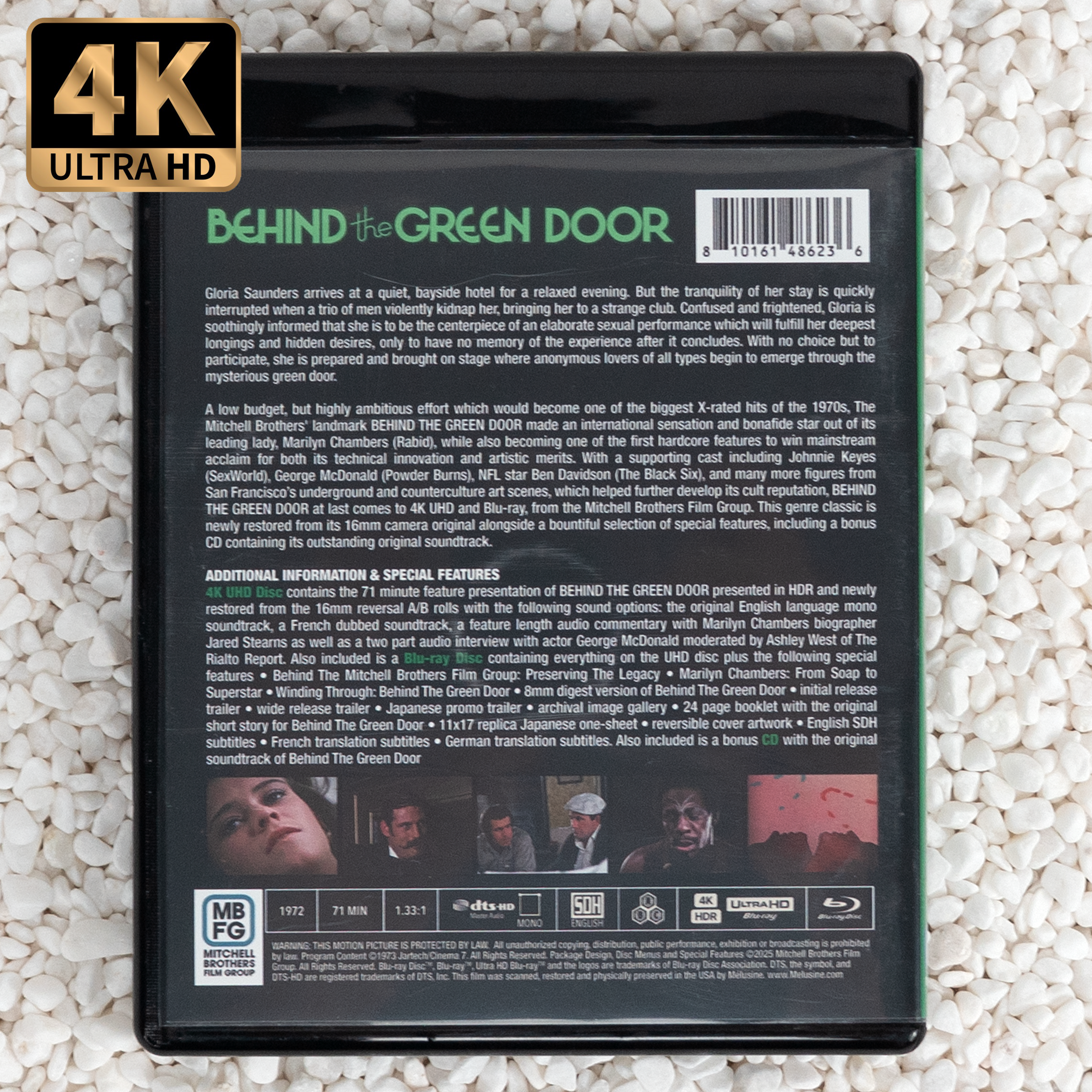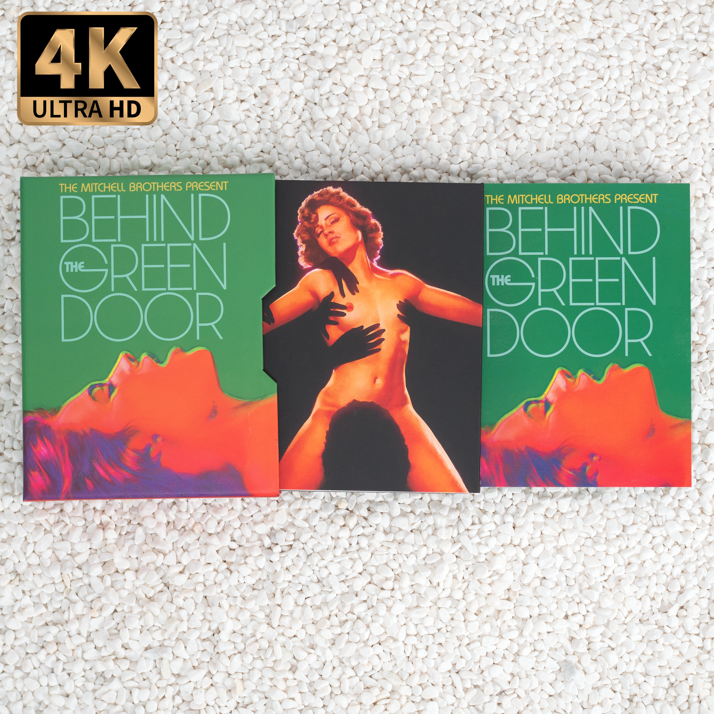 Gloria Saunders arrives at a quiet, bayside hotel for a relaxed evening. But the tranquility of her stay is quickly interrupted when a trio of men violently kidnap her, bringing her to a strange club. Confused and frightened, Gloria is soothingly informed that she is to be the centerpiece of an elaborate sexual performance which will fulfill her deepest longings and hidden desires, only to have no memory of the experience after it concludes. With no choice but to participate, she is prepared and brought on stage where anonymous lovers of all types begin to emerge through the mysterious green door. A low budget, but highly ambitious effort which would become one of the biggest X-rated hits of the 1970s, The Mitchell Brothers' landmark BEHIND THE GREEN DOOR made an international sensation and bonafide star out of its leading lady, Marilyn Chambers (Rabid), while also becoming one of the first hardcore features to win mainstream acclaim for both its technical innovation and artistic merits. With a supporting cast including Johnnie Keyes (SexWorld), George McDonald (Powder Burns), NFL star Ben Davidson (The Black Six), and many more figures from San Francisco’s underground and counterculture art scenes, which helped further develop its cult reputation, BEHIND THE GREEN DOOR at last comes to 4K UHD and Blu-ray, from the Mitchell Brothers Film Group. This genre classic is newly restored from its 16mm camera original alongside a bountiful selection of special features, including a bonus CD containing its outstanding original soundtrack.