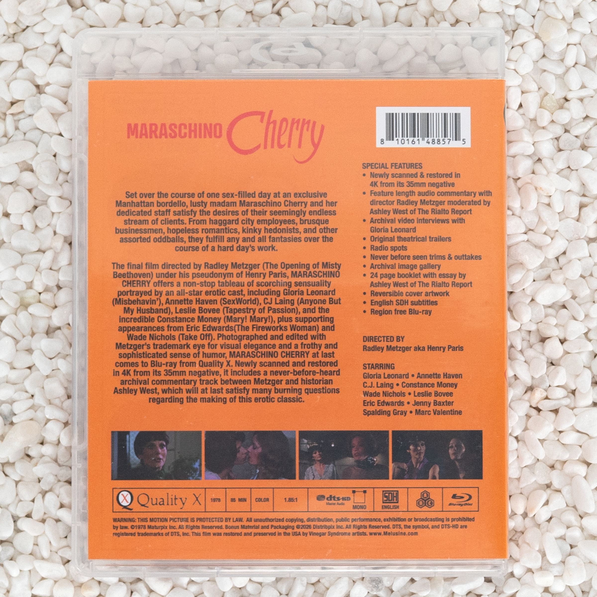 Set over the course of one sex-filled day at an exclusive Manhattan bordello, lusty madam Maraschino Cherry and her dedicated staff satisfy the desires of their seemingly endless stream of clients. From haggard city employees, brusque businessmen, hopeless romantics, kinky hedonists, and other assorted oddballs, they fulfill any and all fantasies over the course of a hard day’s work. The final film directed by Radley Metzger (The Opening of Misty Beethoven) under his pseudonym of Henry Paris, MARASCHINO CHERRY offers a non-stop tableau of scorching sensuality portrayed by an all-star erotic cast, including Gloria Leonard (Misbehavin’), Annette Haven (SexWorld), CJ Laing (Anyone But My Husband), Leslie Bovee (Tapestry of Passion), and the incredible Constance Money (Mary! Mary!), plus supporting appearances from Eric Edwards (The Fireworks Woman) and Wade Nichols (Take Off). Photographed and edited with Metzger’s trademark eye for visual elegance and a frothy and sophisticated sense of humor, MARASCHINO CHERRY at last comes to Blu-ray from Quality X. Newly scanned and restored in 4K from its 35mm negative, it includes a never-before-heard archival commentary track between Metzger and historian Ashley West, which will at last satisfy many burning questions regarding the making of this erotic classic.